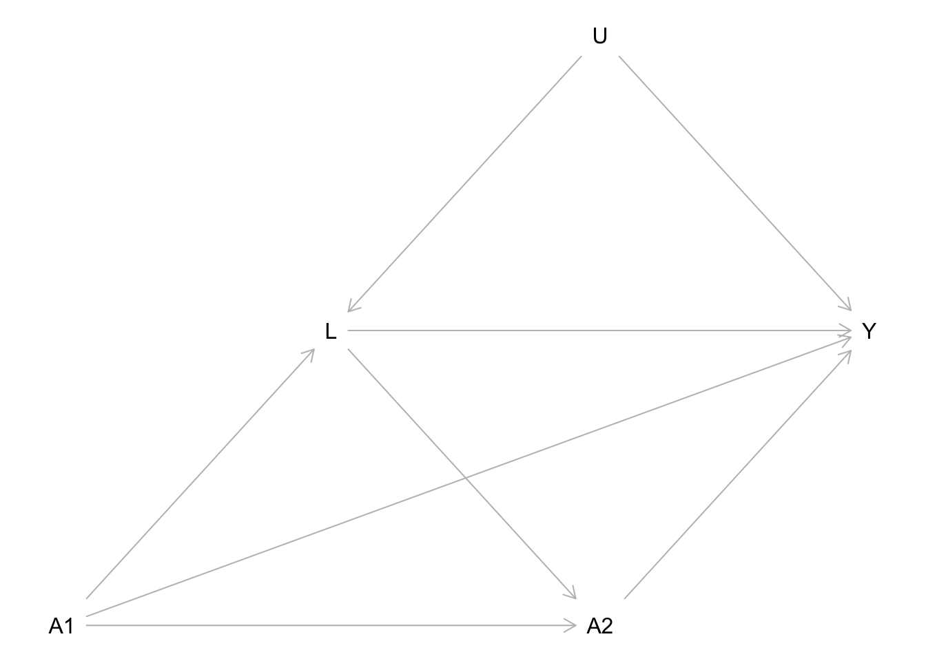The DAG only specifies the causal relationships, e.g., \(L\) is a function of \(A_1\) and \(U\). However, this information does not fully specify the data generating process. To simulate data, we must specify the exact functions that produce all variables. We use gaussian linear models for continuous variables (\(L\) and \(Y\)) and a probit model for the binary variable \(A_2\), while \(A_1\) is fully randomized.